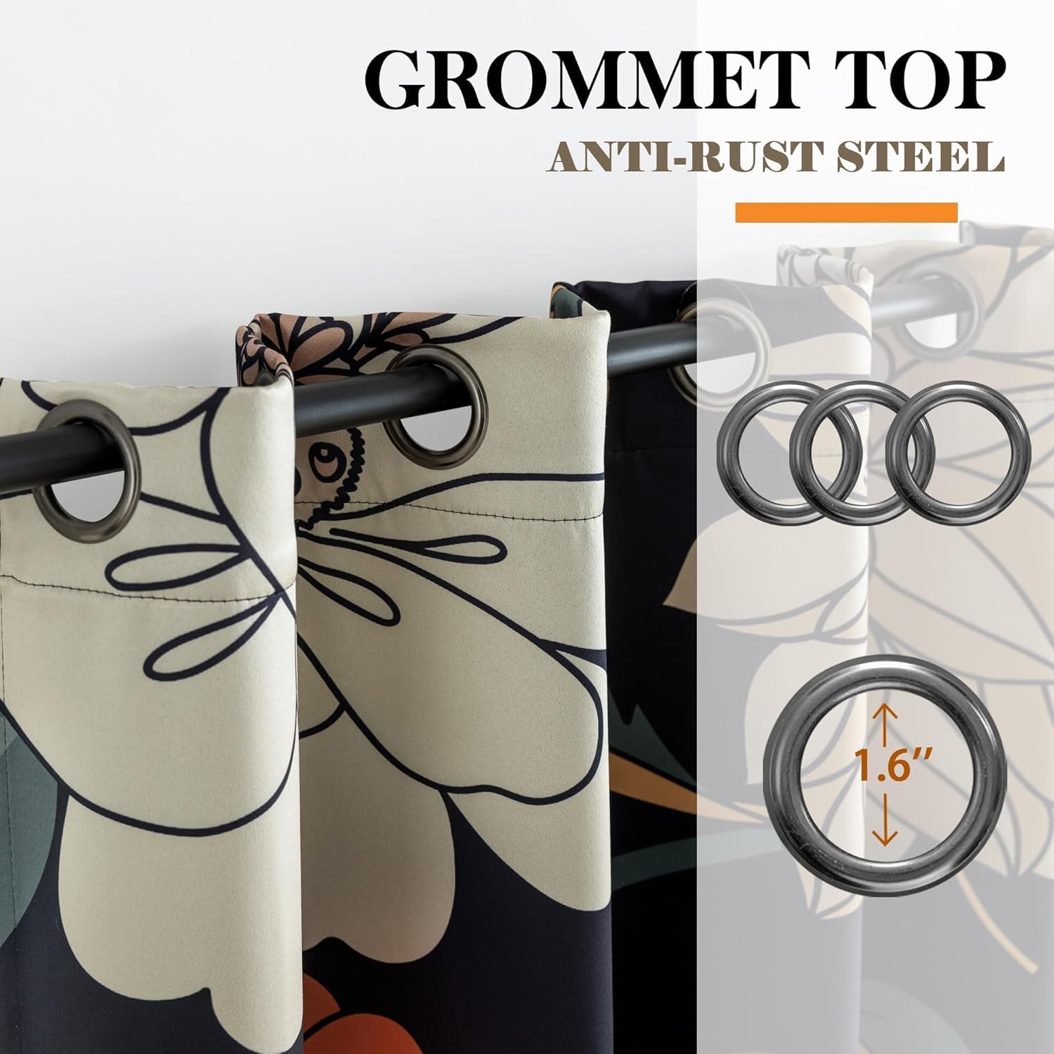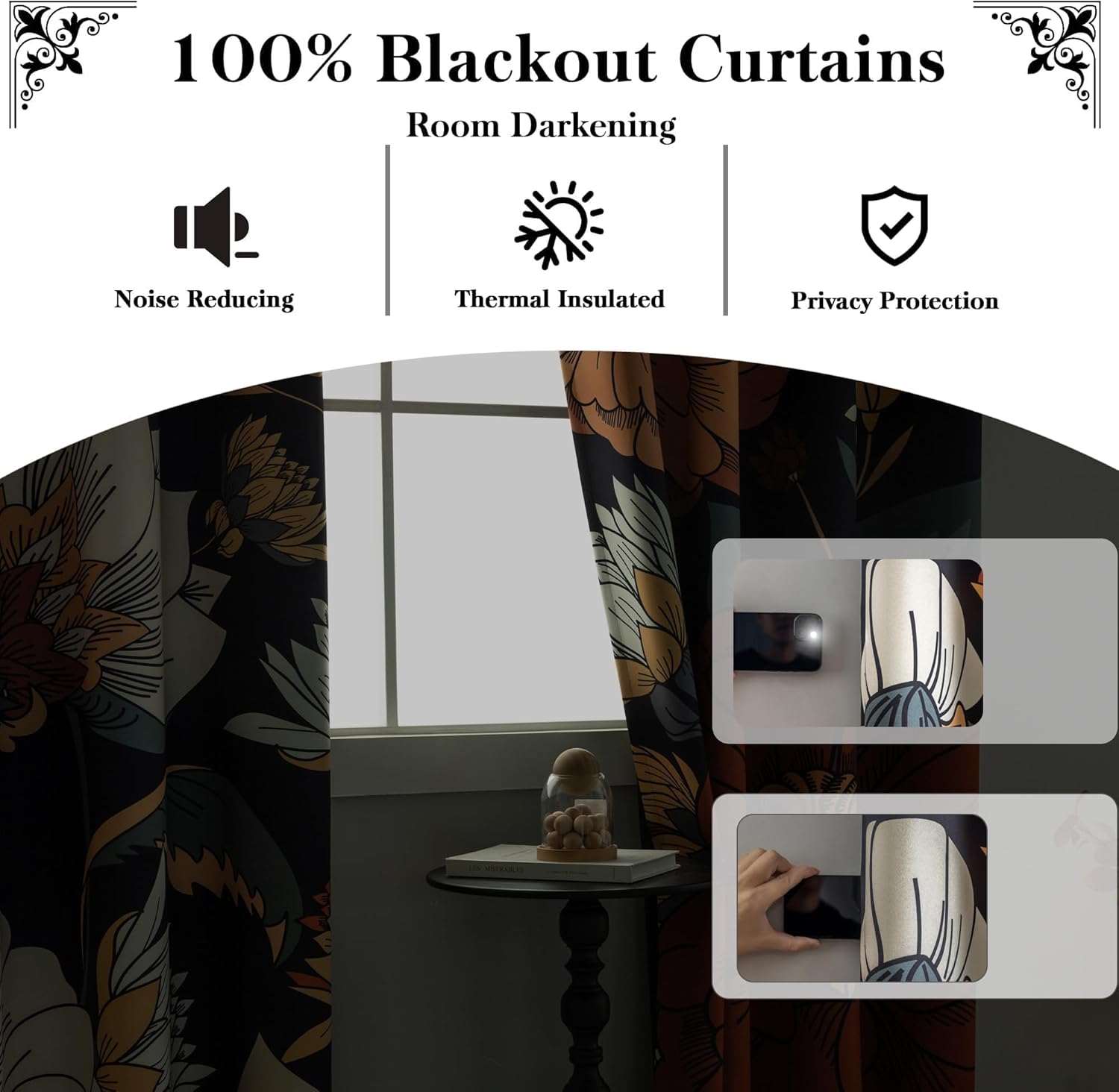 Black Boho Floral 100% Blackout Curtains for Bedroom 84 inch Long 2 Panels Mid Century Botanical Black Out Curtains for Living Room Grommet Thermal Insulated Room Darkening Window Drapes,52Wx84L